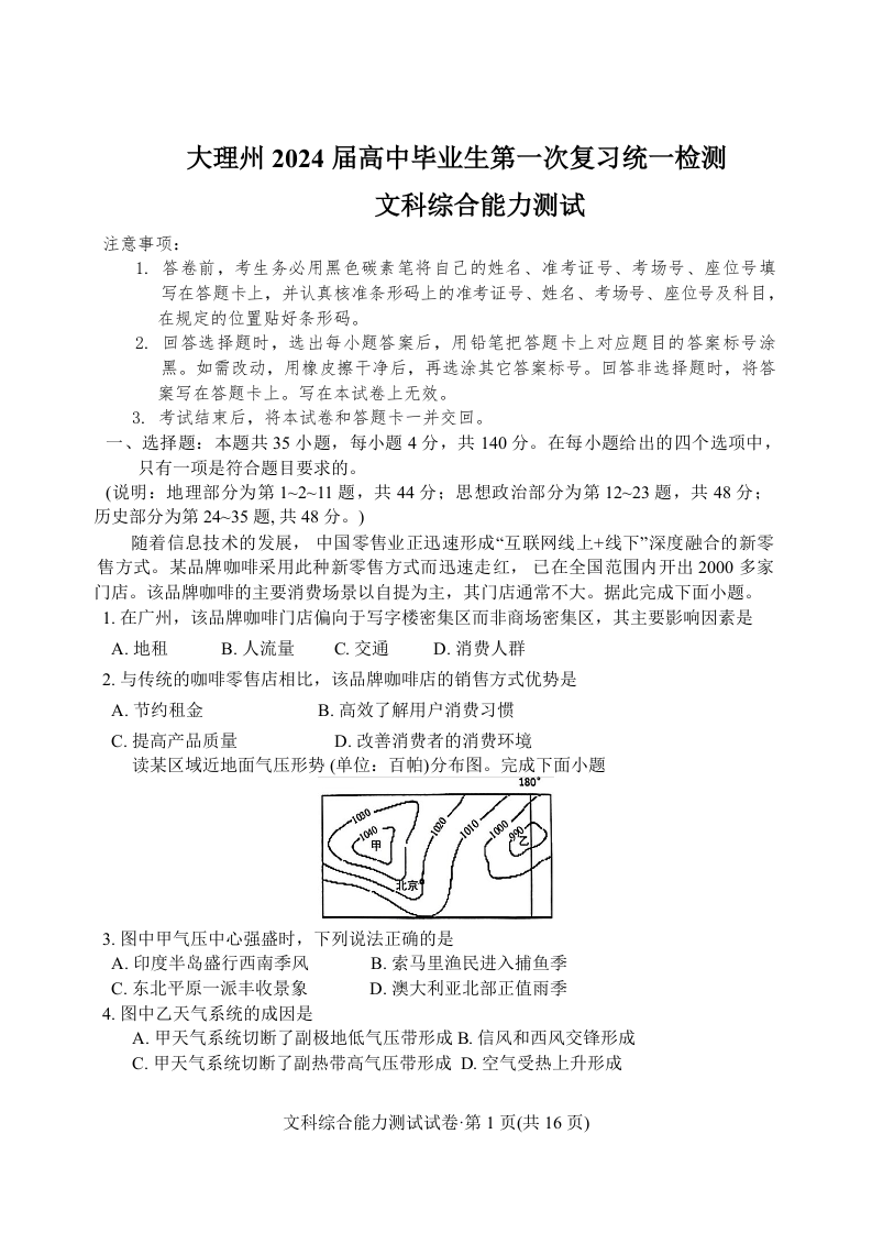 云南省大理州2024届高三毕业生第一次复习统一检测文综