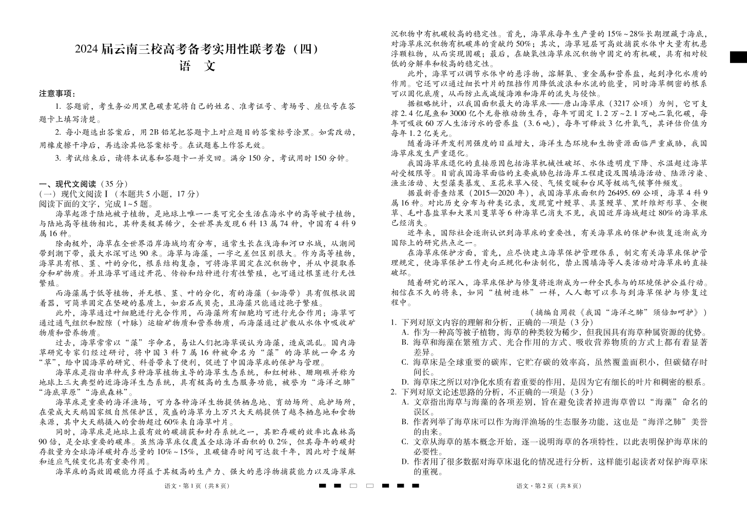 云南省三校2024届高三高考备考实用性联考卷(四)语文