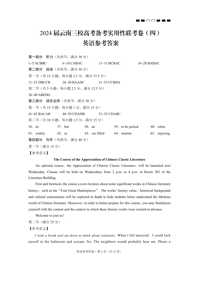 云南省三校2024届高三高考备考实用性联考卷(四)英语答案