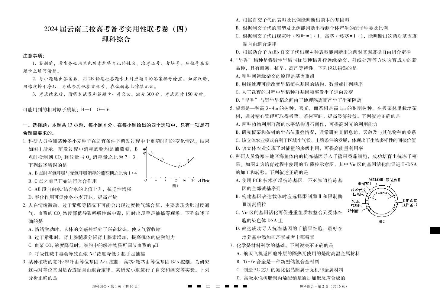 云南省三校2024届高三高考备考实用性联考卷(四)理综