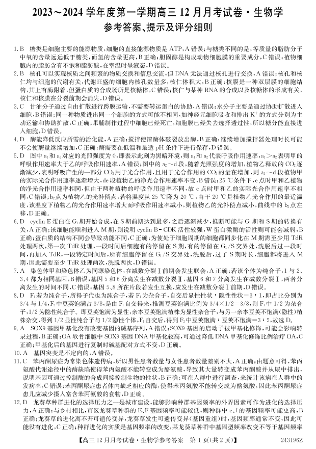 山西省吕梁市孝义市2024届高三上学期12月月考生物答案
