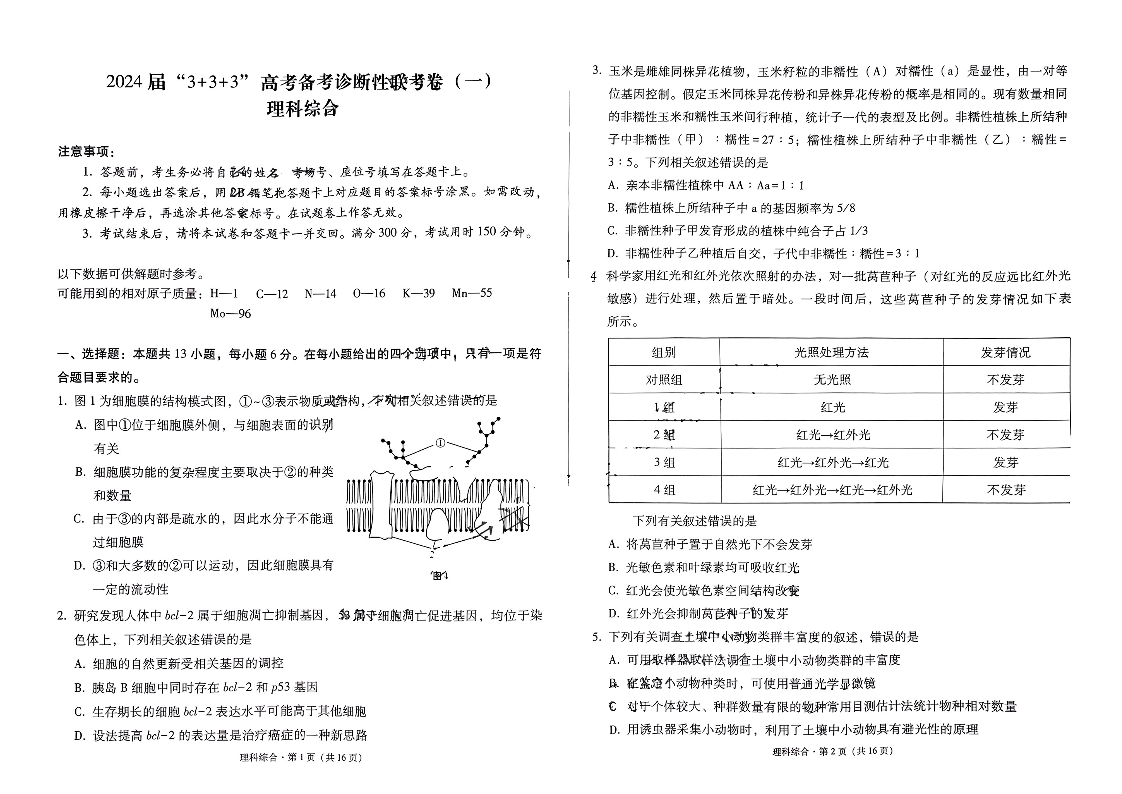 云南省2024届3+3+3高考备考诊断性联考卷(一)理综