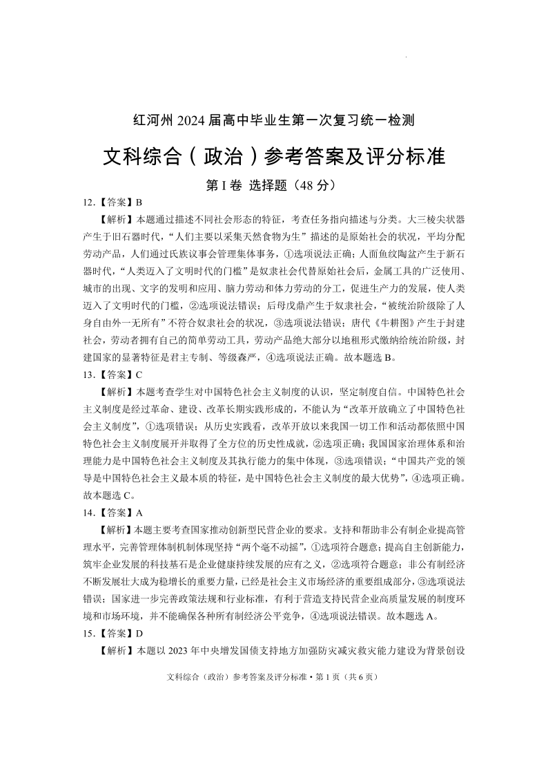 云南省红河州2024届高中毕业生第一次复习统一检测文综政治答案