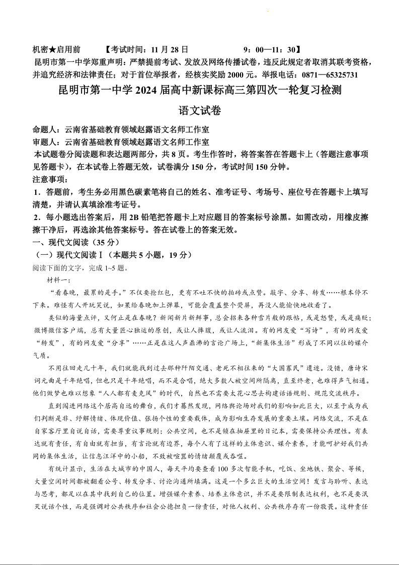 云南省昆明市第一中学2024届高中新课标高三第四次一轮复习检测语文