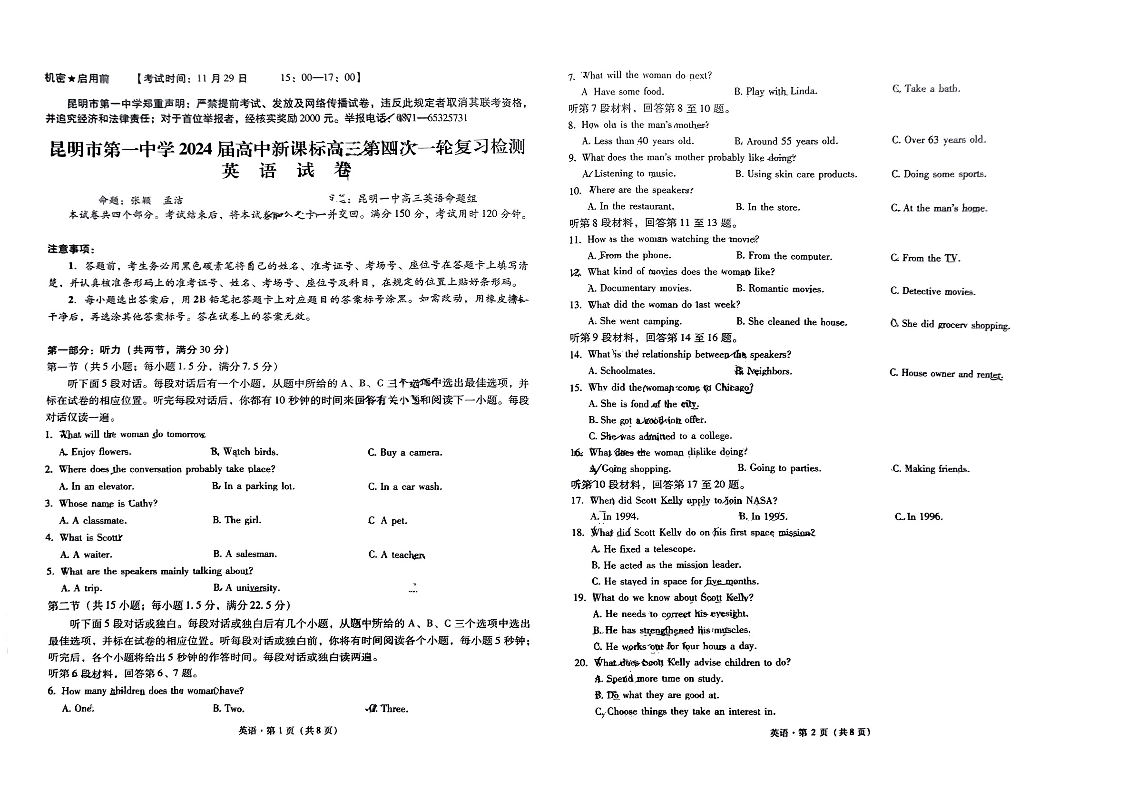 云南省昆明市第一中学2024届高中新课标高三第四次一轮复习检测英语
