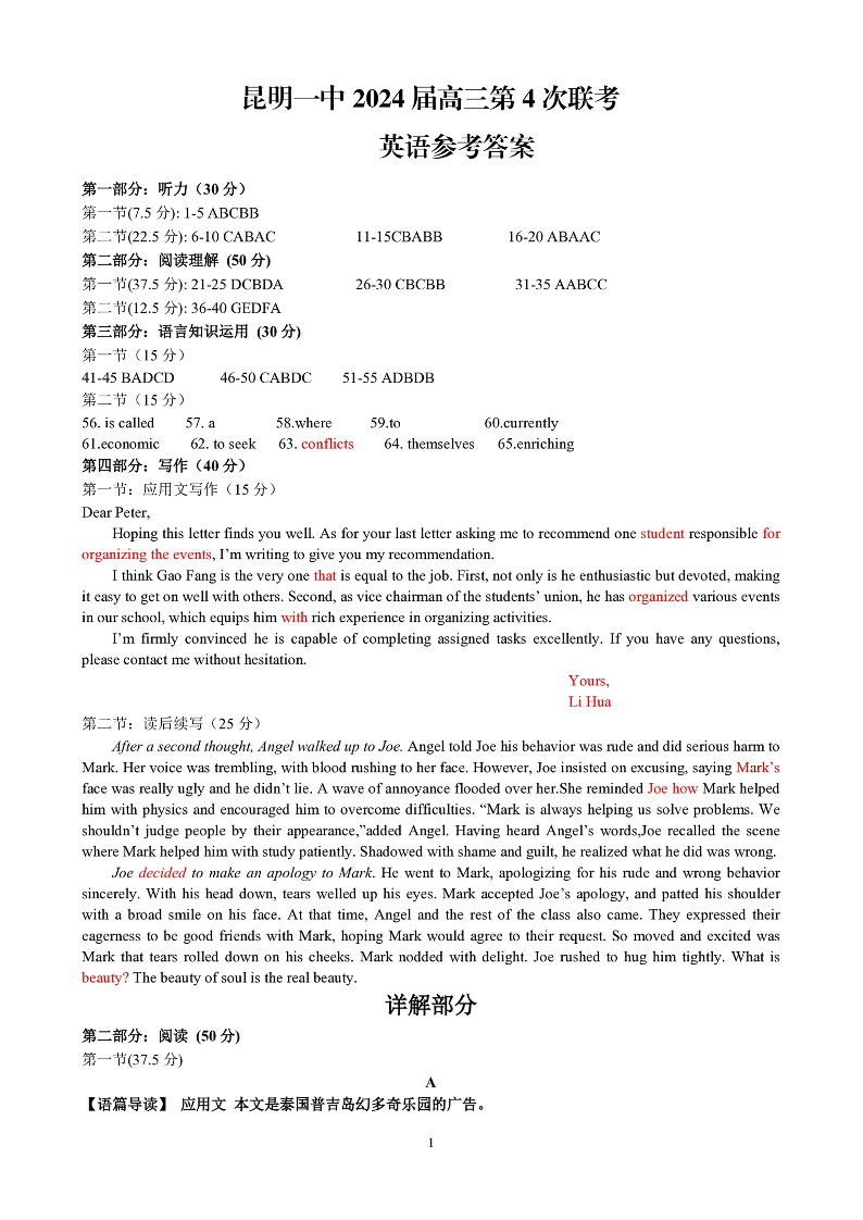 云南省昆明市第一中学2024届高中新课标高三第四次一轮复习检测英语答案