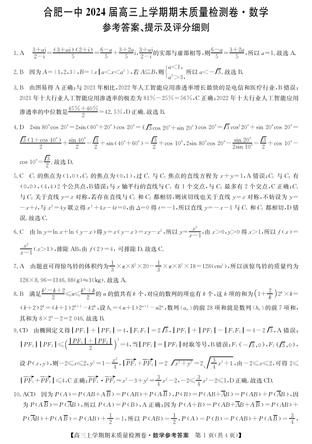 安徽省池州市2024届高三上学期1月期末考试数学答案