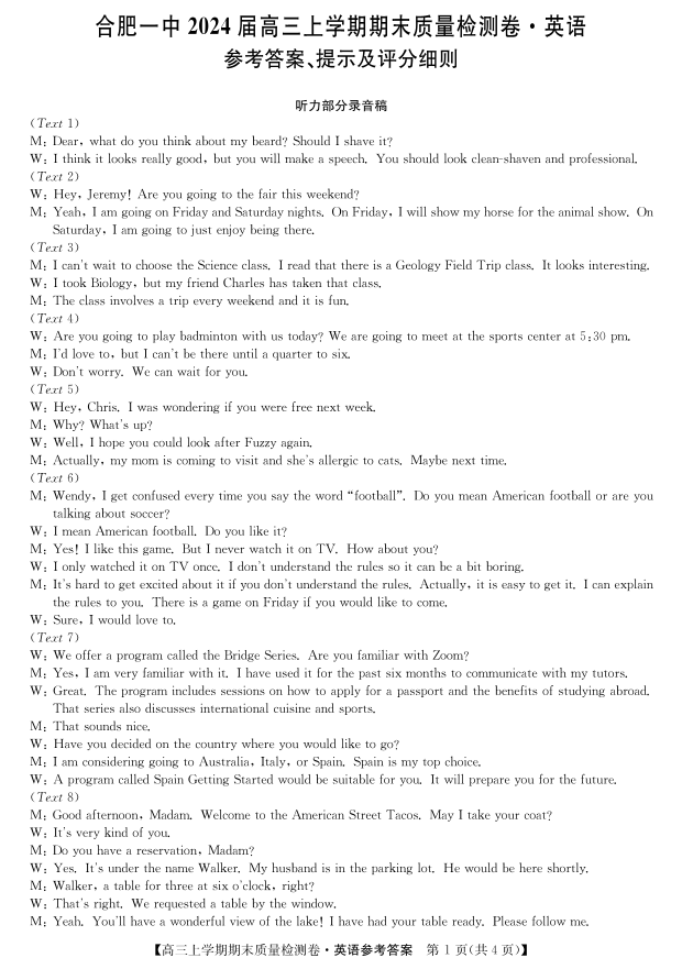 安徽省池州市2024届高三上学期1月期末考试英语答案