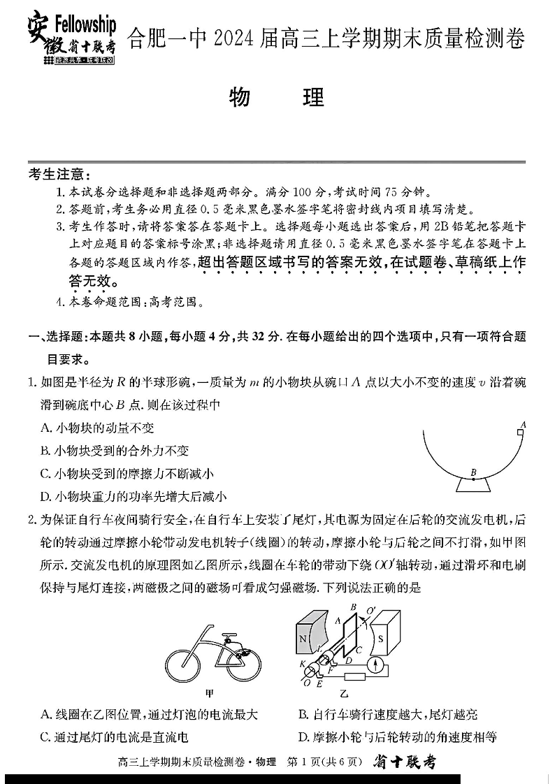 安徽省池州市2024届高三上学期1月期末考试物理+答案