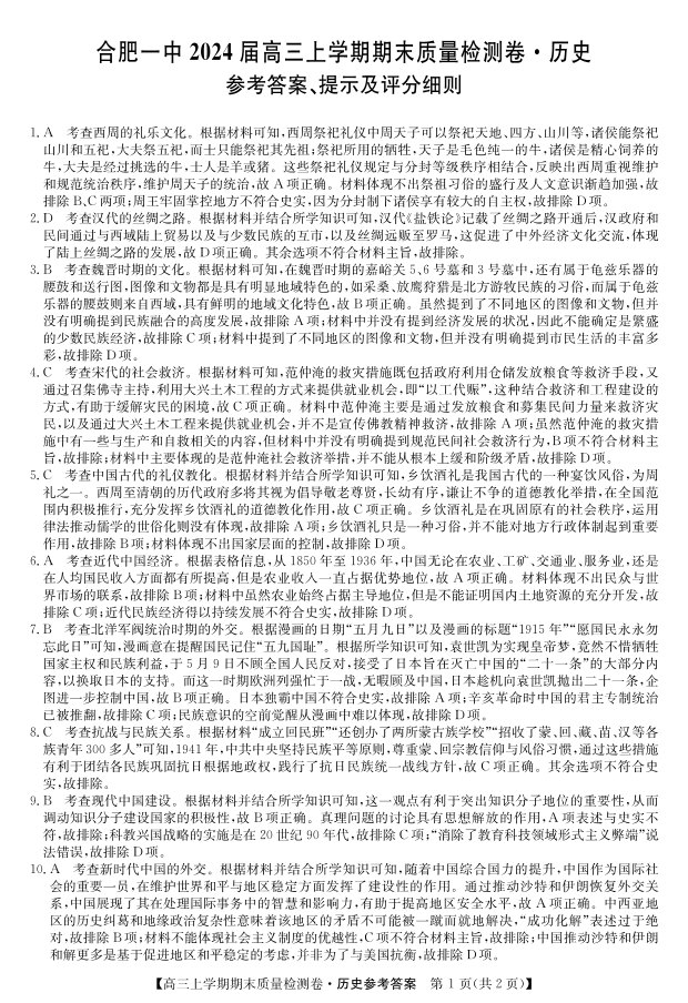 安徽省池州市2024届高三上学期1月期末考试历史答案