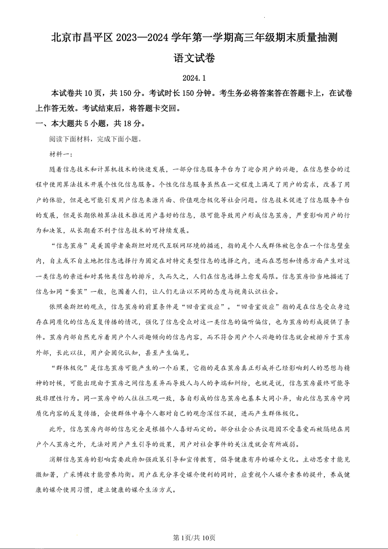 北京市昌平区2024届高三上学期期末考试语文(原卷版)