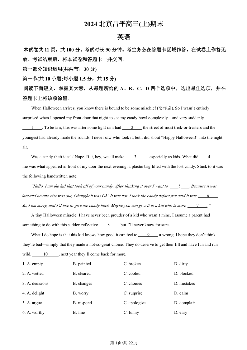 北京市昌平区2024届高三上学期期末考试英语(精品解析版)
