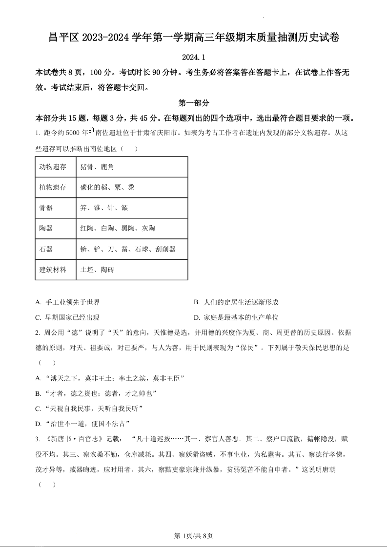 北京市昌平区2024届高三上学期期末考试历史(原卷版)