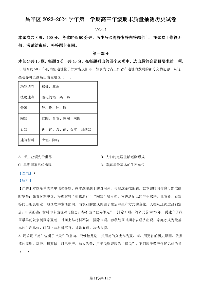 北京市昌平区2024届高三上学期期末考试历史(精品解析版)