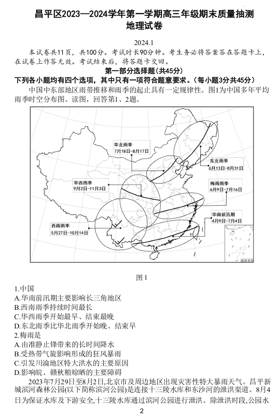 北京市昌平区2024届高三上学期期末考试地理+答案