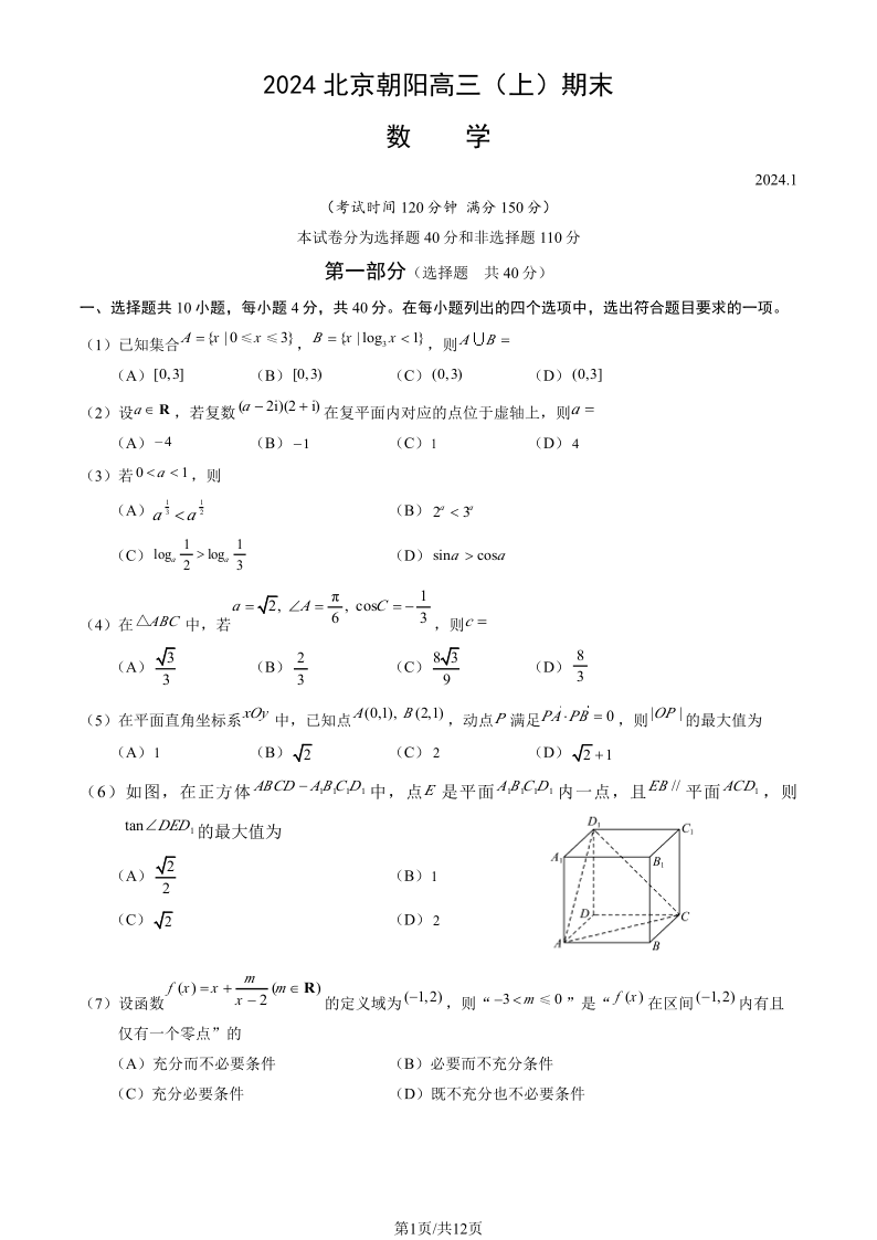 北京市朝阳区2024届高三期末数学+答案