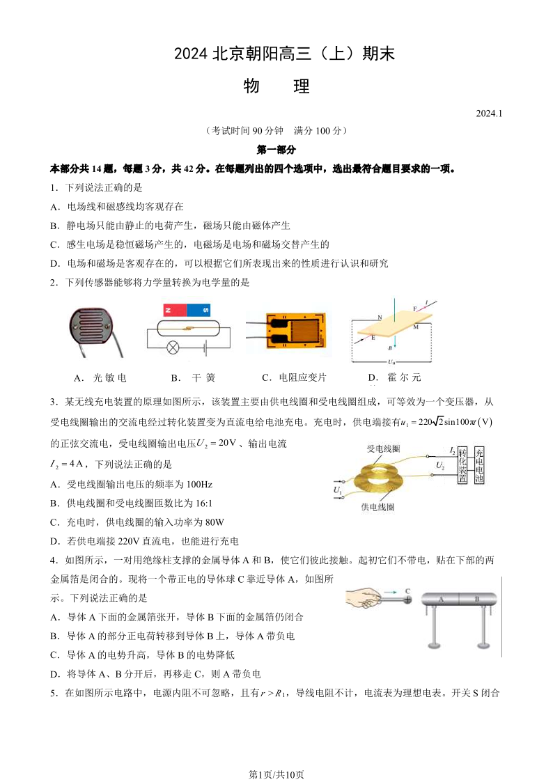 北京市朝阳区2024届高三期末物理+答案
