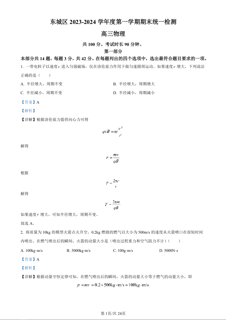北京市东城区2024届高三上学期期末统一检测物理(精品解析版)