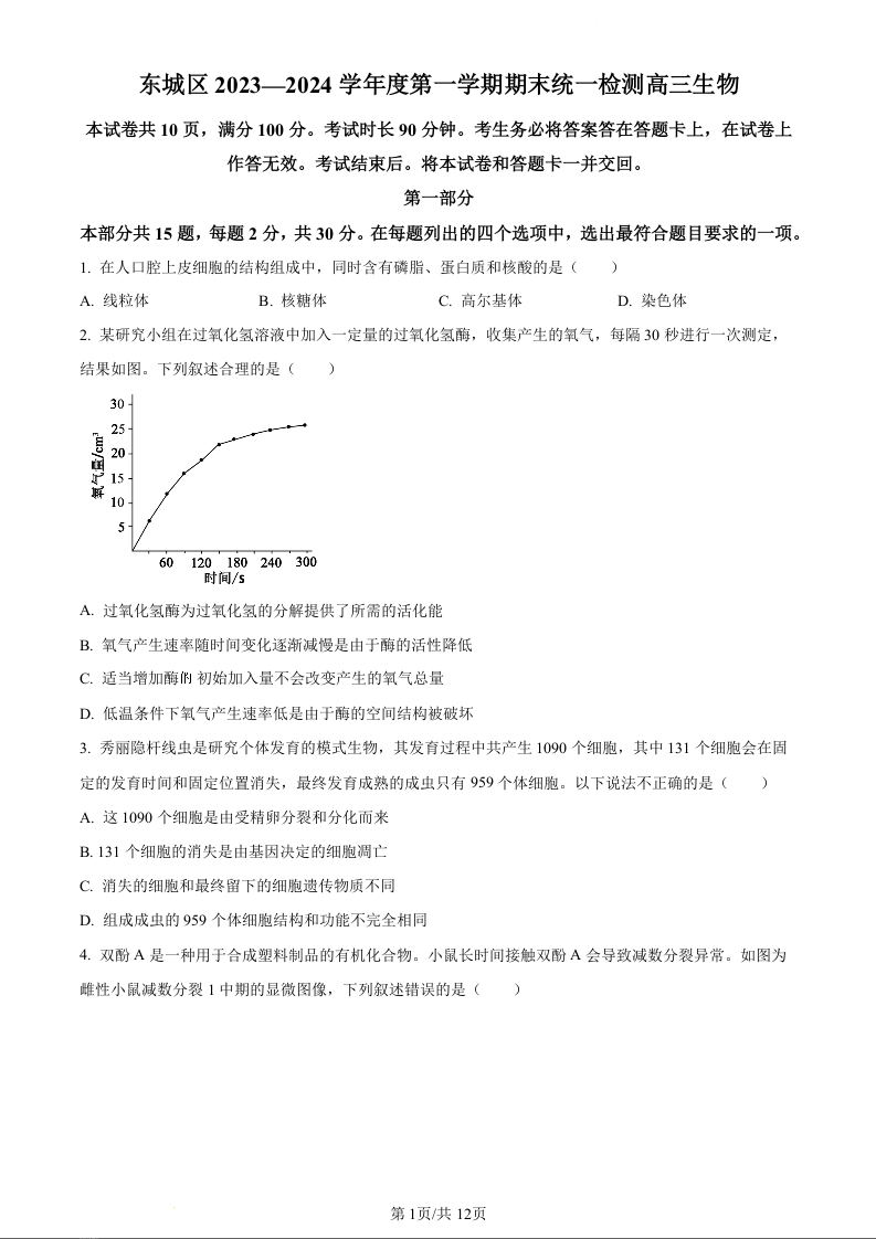 北京市东城区2024届高三上学期期末统一检测生物(原卷版)