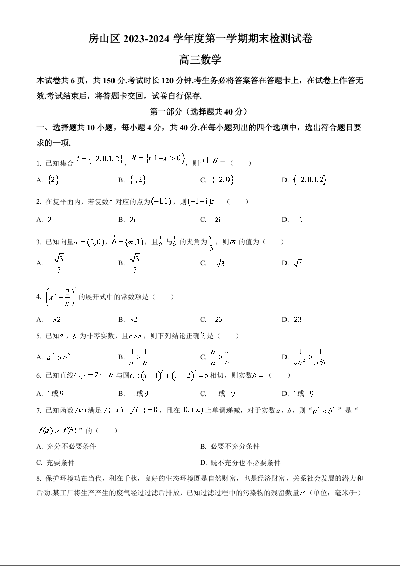 北京市房山区2024届高三上学期期末考试数学+答案