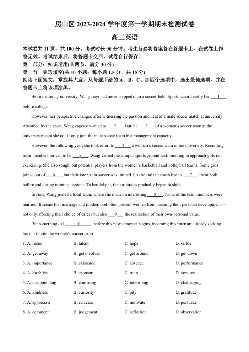 北京市房山区2024届高三上学期期末考试英语+答案