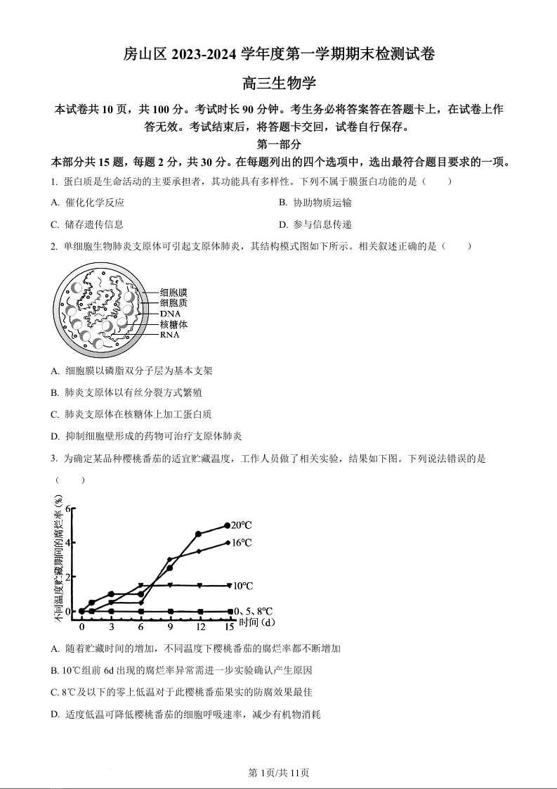 北京市房山区2024届高三上学期期末考试生物(原卷版)