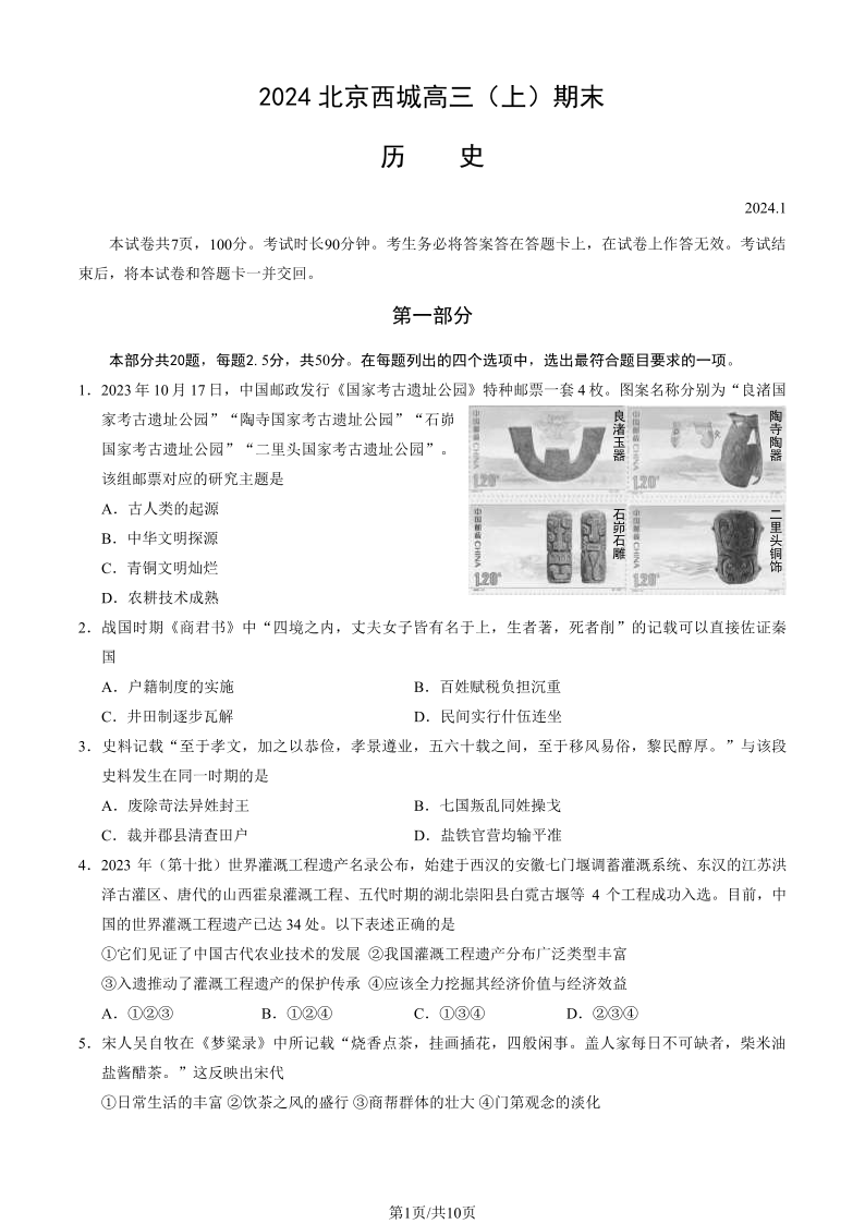 北京市西城区2024届高三期末历史+答案