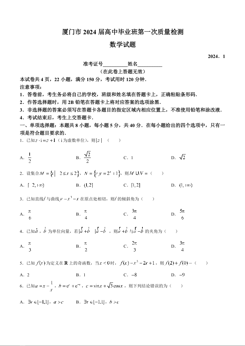 福建省部分地市2024届高三上学期第一次质量检测数学