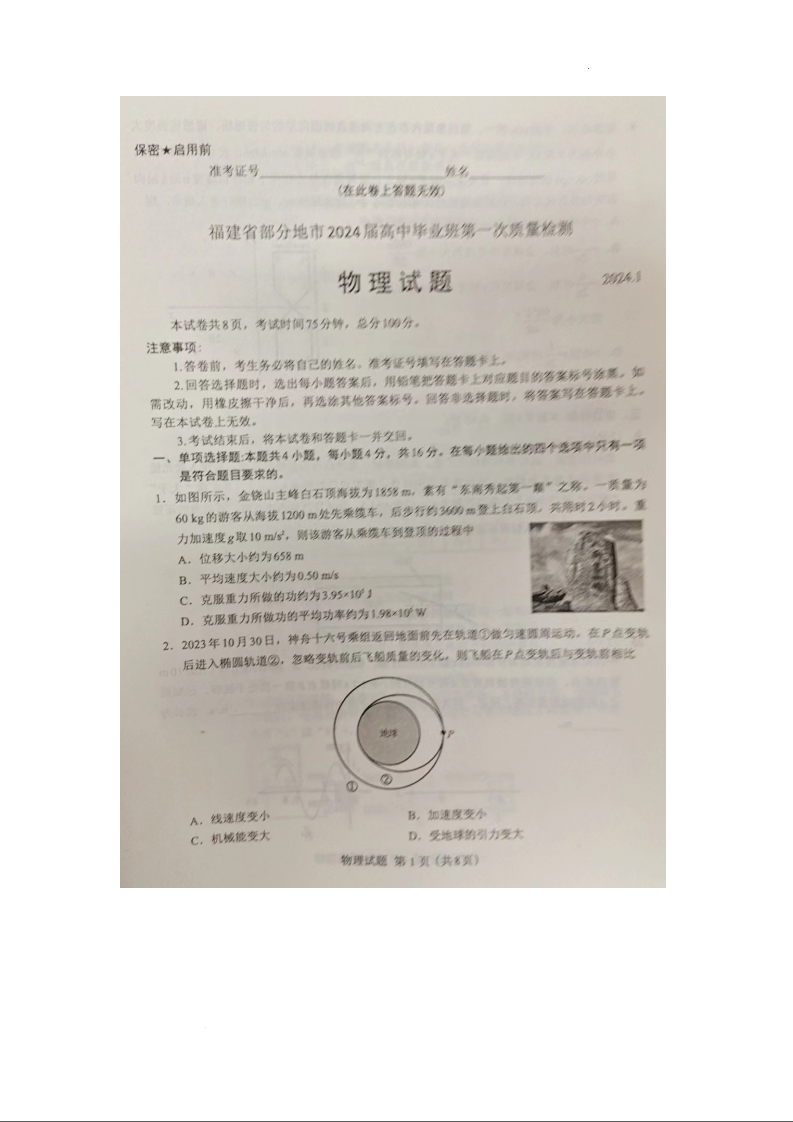 福建省部分地市2024届高三上学期第一次质量检测物理