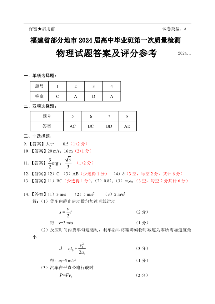 福建省部分地市2024届高三上学期第一次质量检测物理答案