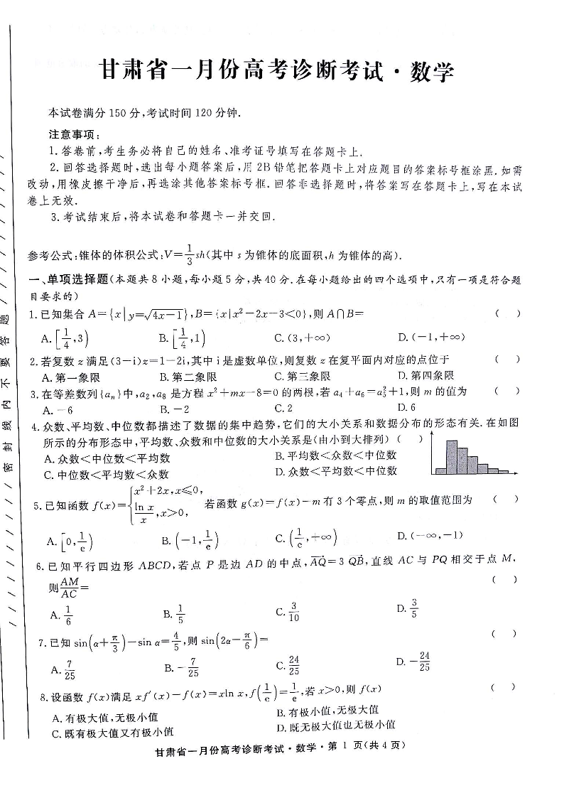甘肃省2024届高三上学期1月份高考诊断考试(甘肃一诊)数学+答案