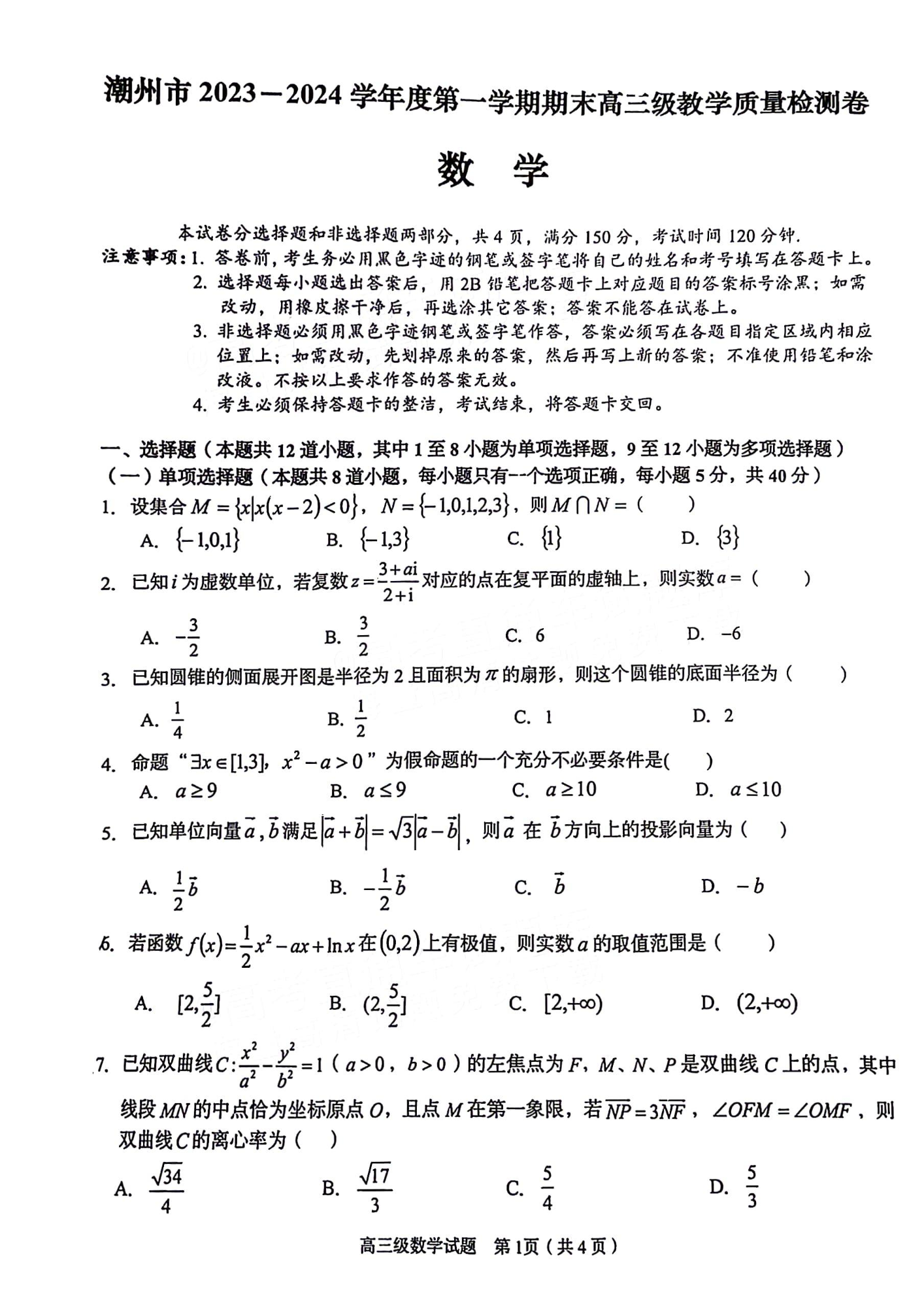 广东省潮州市2024届高三上学期期末考试数学+答案