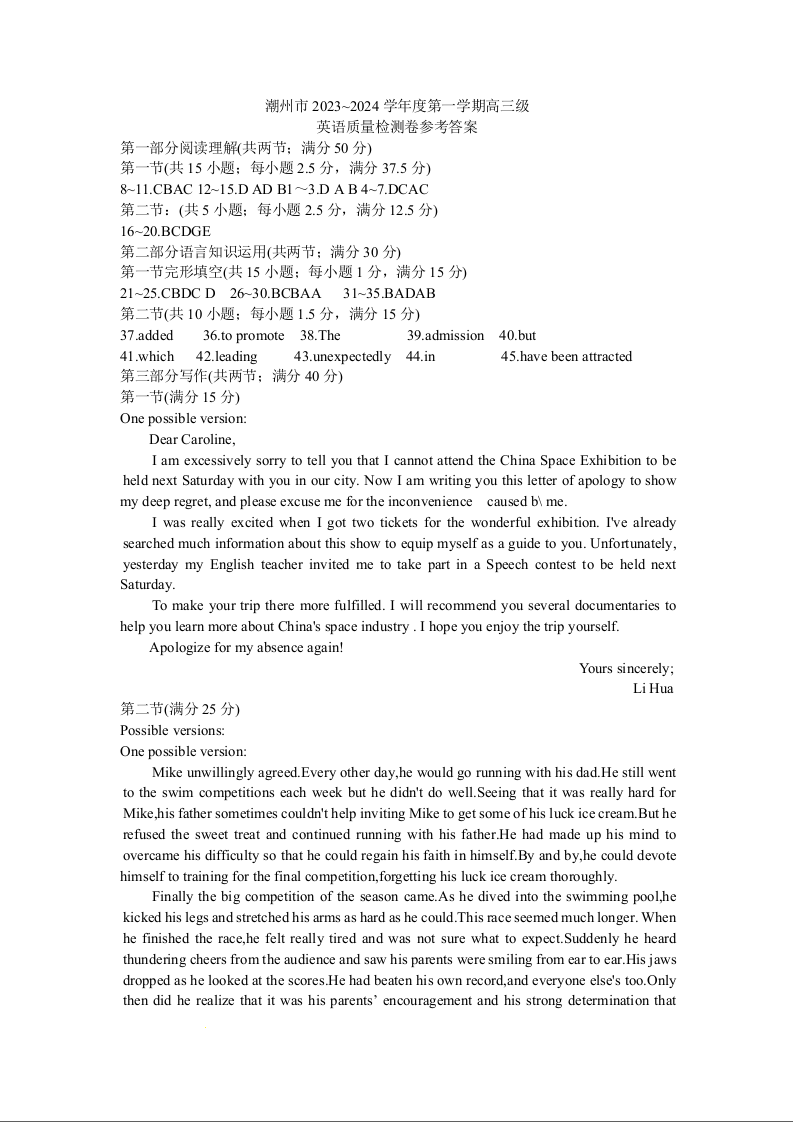 广东省潮州市2024届高三上学期期末考试英语答案