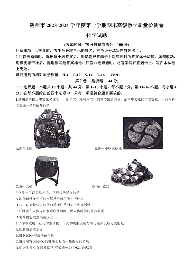 广东省潮州市2024届高三上学期期末考试化学+答案