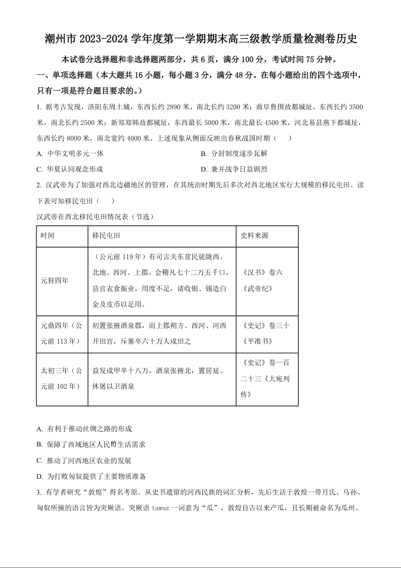 广东省潮州市2024届高三上学期期末考试历史(原卷版)