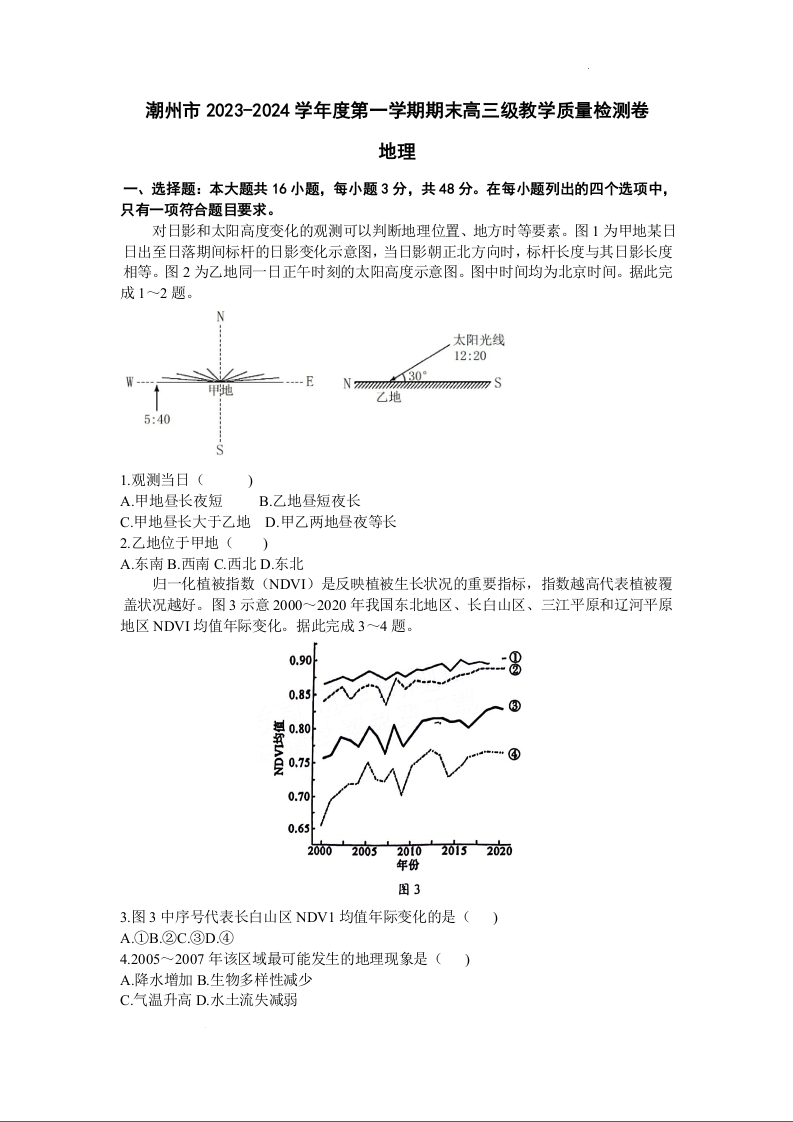广东省潮州市2024届高三上学期期末考试地理+答案
