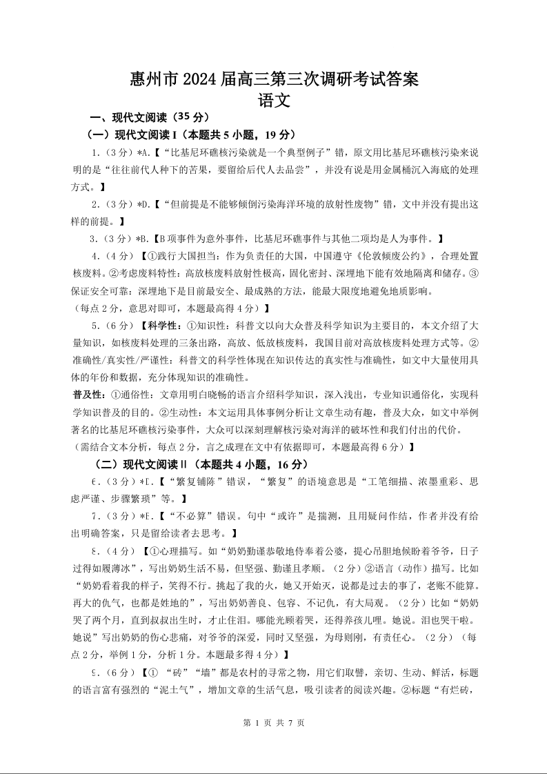广东省惠州市2024届高三上学期第三次调研考试语文答案