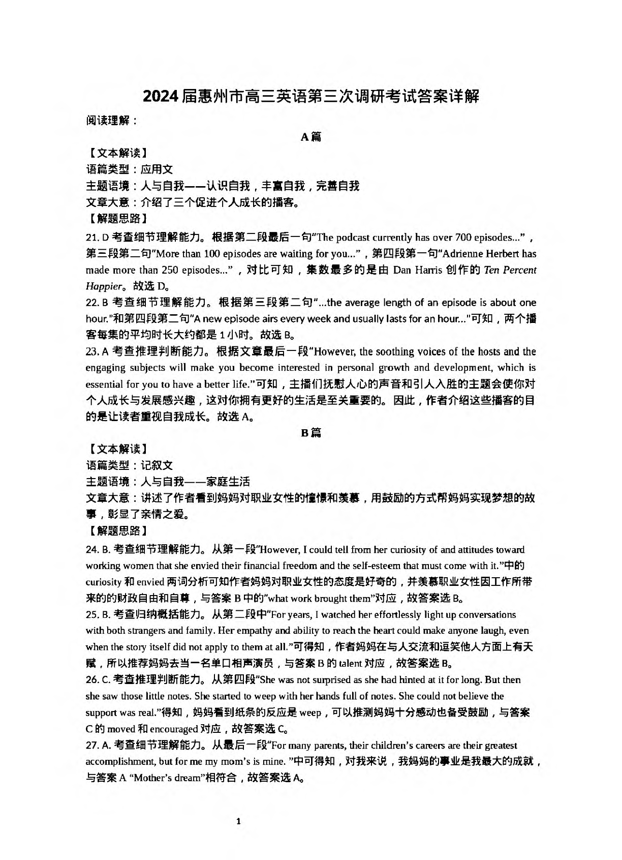 广东省惠州市2024届高三上学期第三次调研考试英语答案
