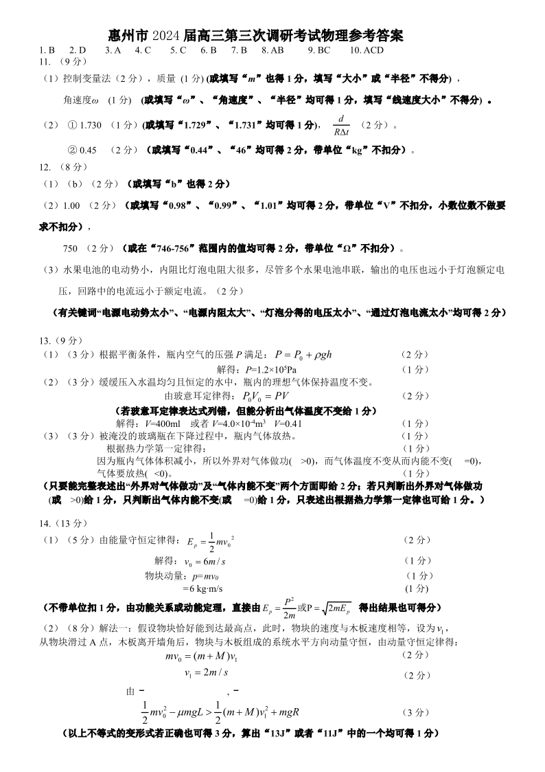 广东省惠州市2024届高三上学期第三次调研考试物理答案