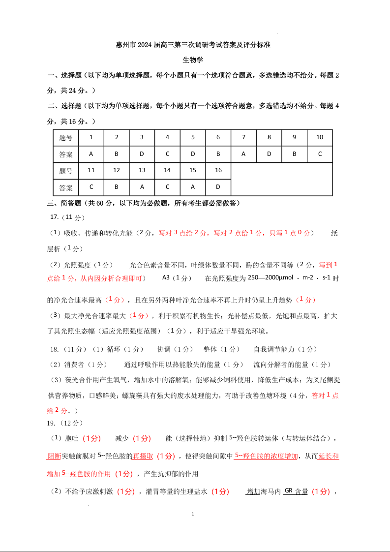 广东省惠州市2024届高三上学期第三次调研考试生物答案