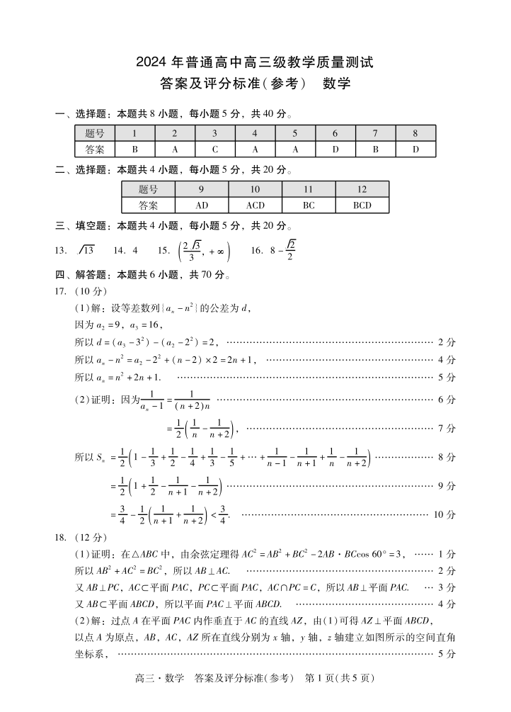 广东省揭阳市汕尾市2024届高三上学期1月期末考试数学答案