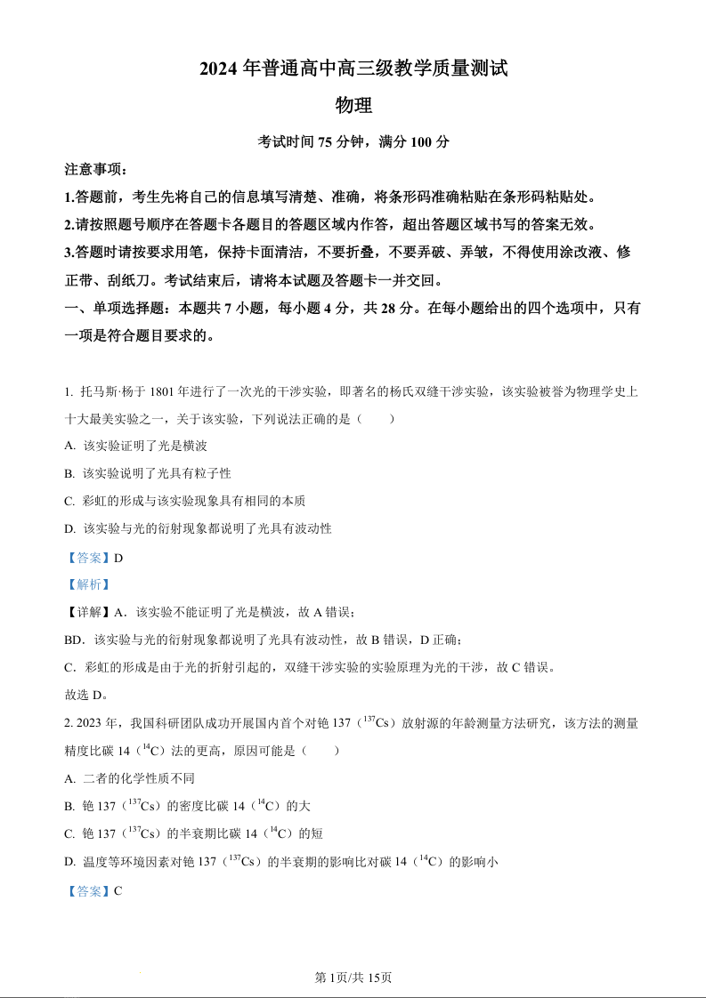 广东省揭阳市汕尾市2024届高三上学期1月期末考试物理(精品解析版)