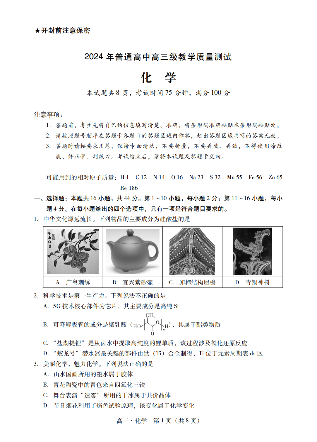 广东省揭阳市汕尾市2024届高三上学期1月期末考试化学