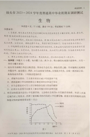 广东省汕头市2024届高三上学期期末考试生物
