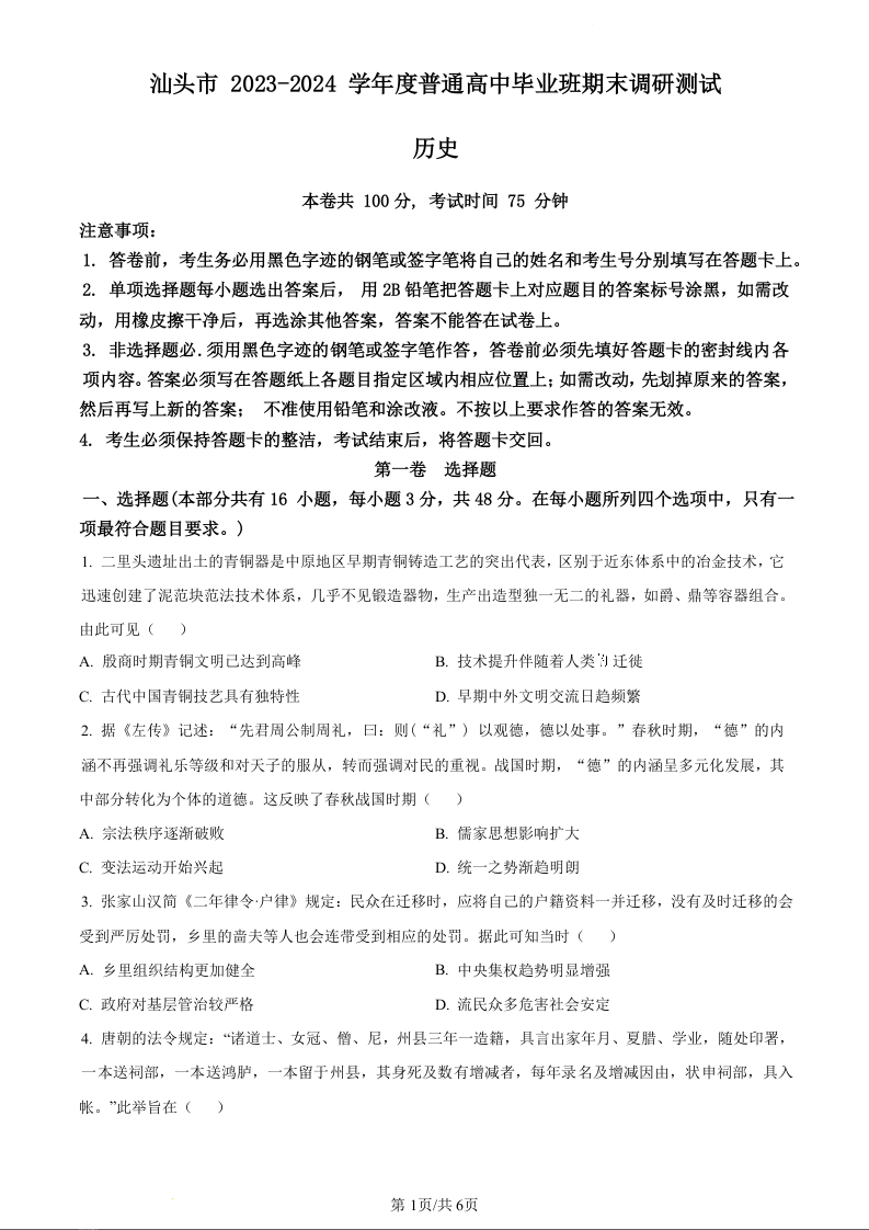 广东省汕头市2024届高三上学期期末考试历史(原卷版)
