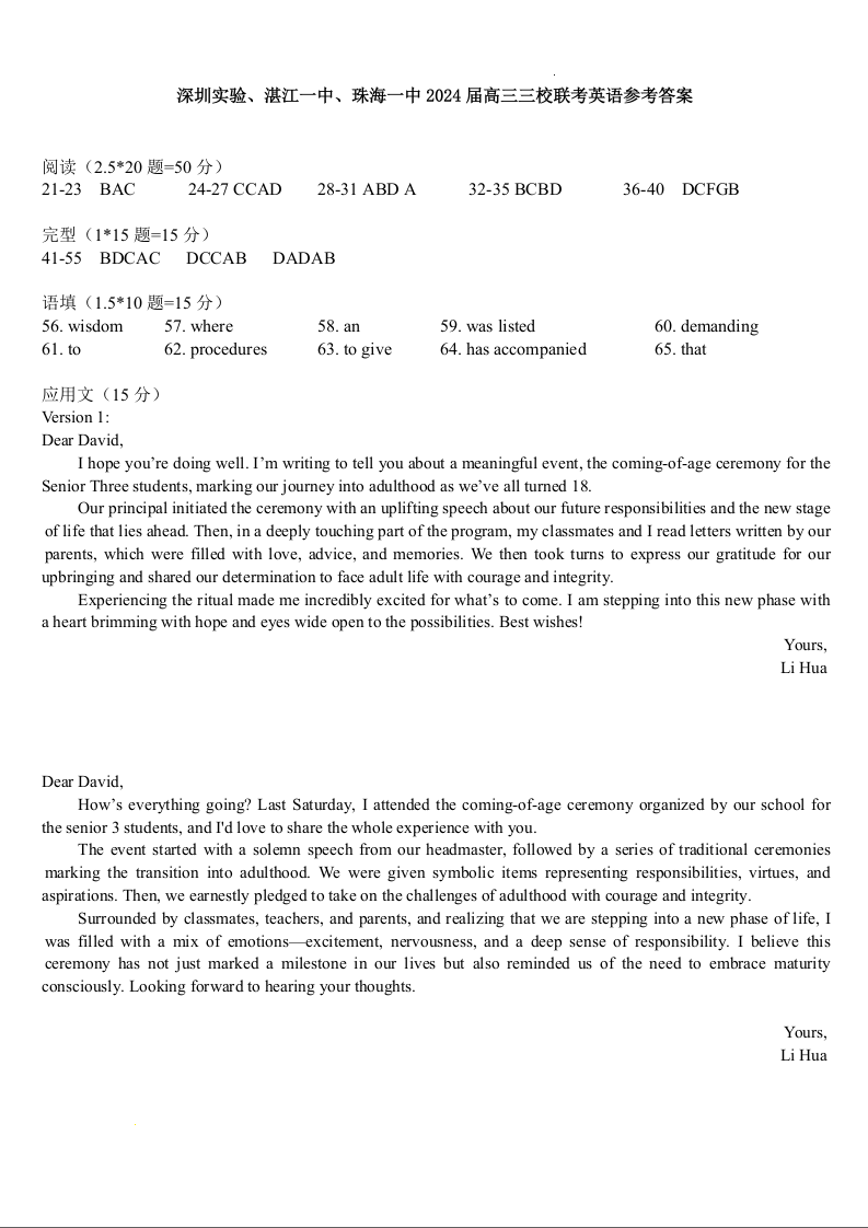 广东省深圳实验,湛江一中,珠海一中2024届高三上学期12月联考英语答案