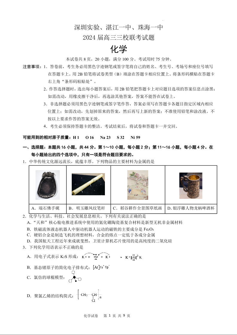 广东省深圳实验,湛江一中,珠海一中2024届高三上学期12月联考化学