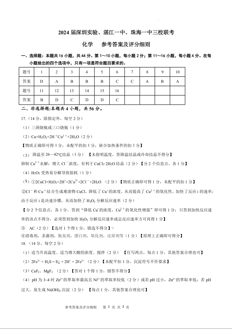 广东省深圳实验,湛江一中,珠海一中2024届高三上学期12月联考化学答案