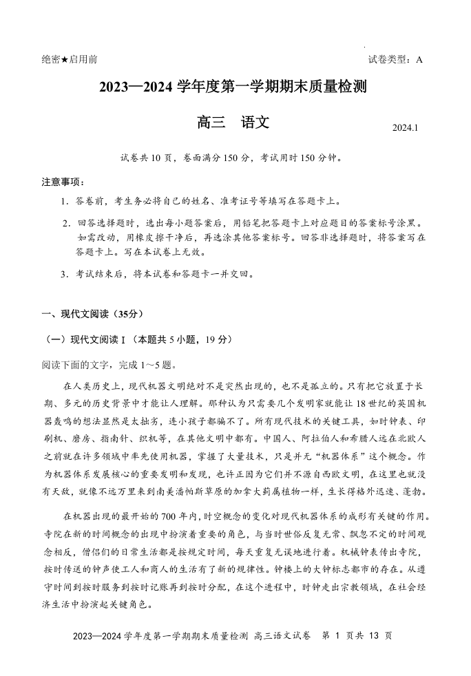 广东省深圳市罗湖区2024届高三上学期期末质量监测语文