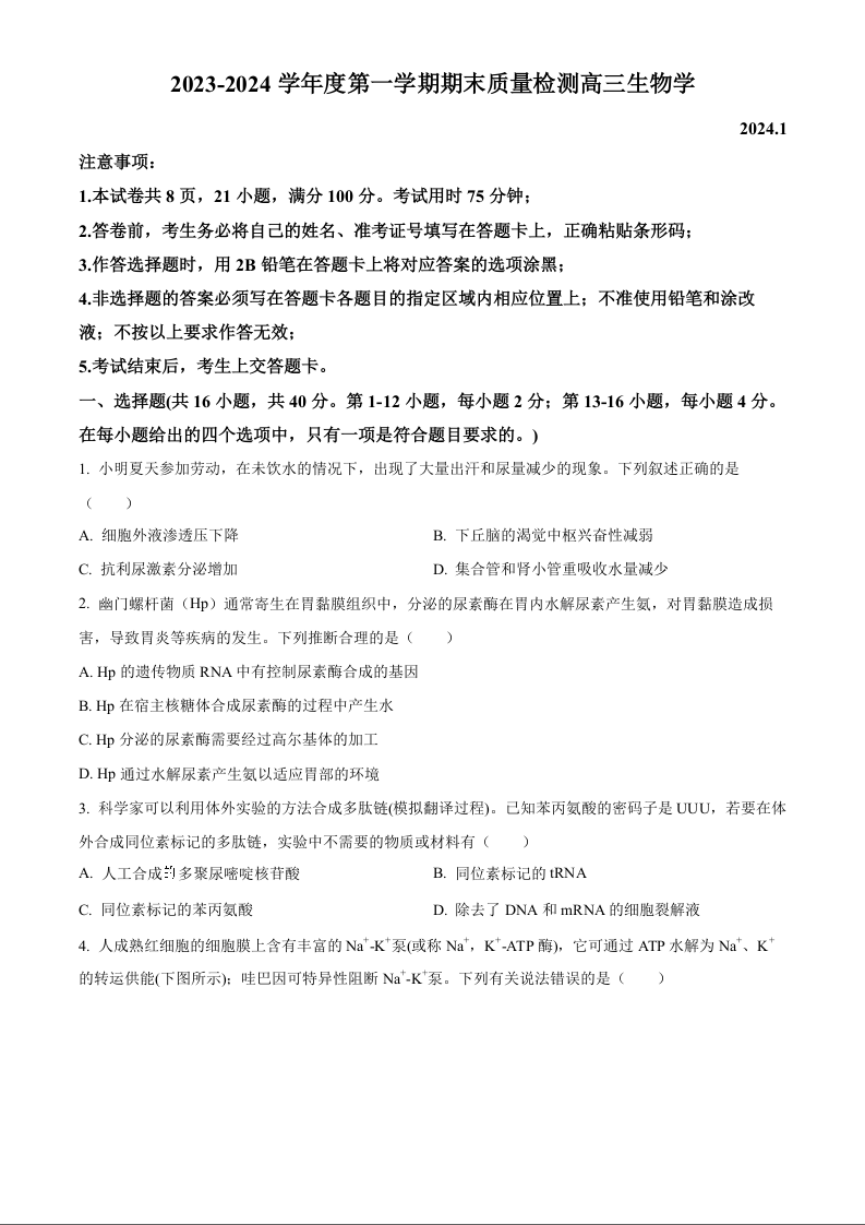 广东省深圳市罗湖区2024届高三上学期期末质量监测生物(原卷版)